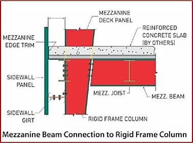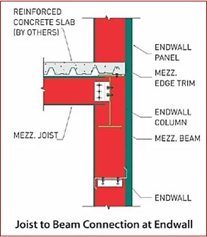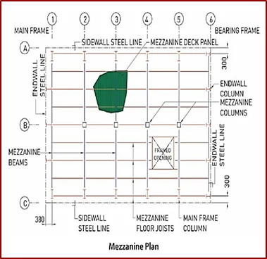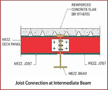 The mezzanine Floor system consists of galvanized steel Decking supported by a joist that is connected to the main mezzanine beams. A reinforced concrete slab(not supplied by Harshith) is cast in situ on top of the steel decking. The primary mezzanine beams usually run across the width of the building and the joist mostly run lengthwise (parallel to the roof purlins)